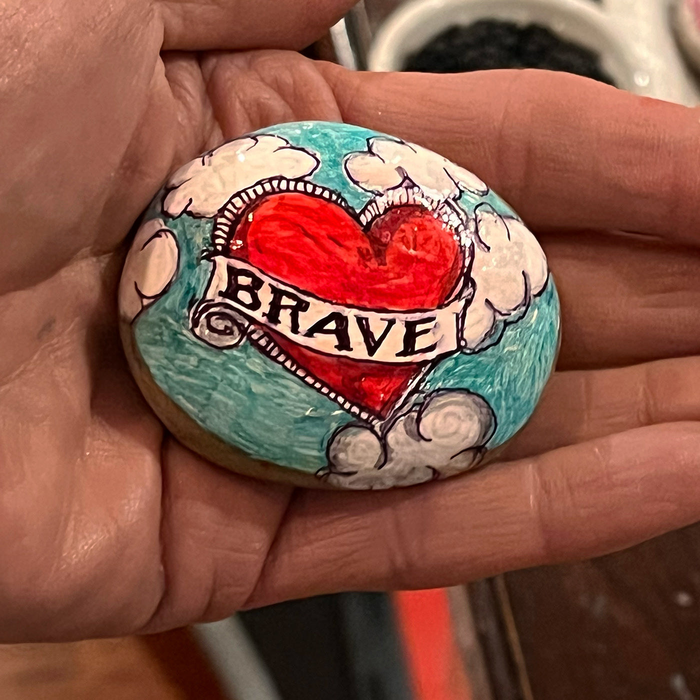 One of a kind, hand painted stones make such a personal gift! This heart with the "brave" banner was inspired by a vintage tattoo. I believe the power of words coupled with a beautiful image will inspire you to take risks and be brave!